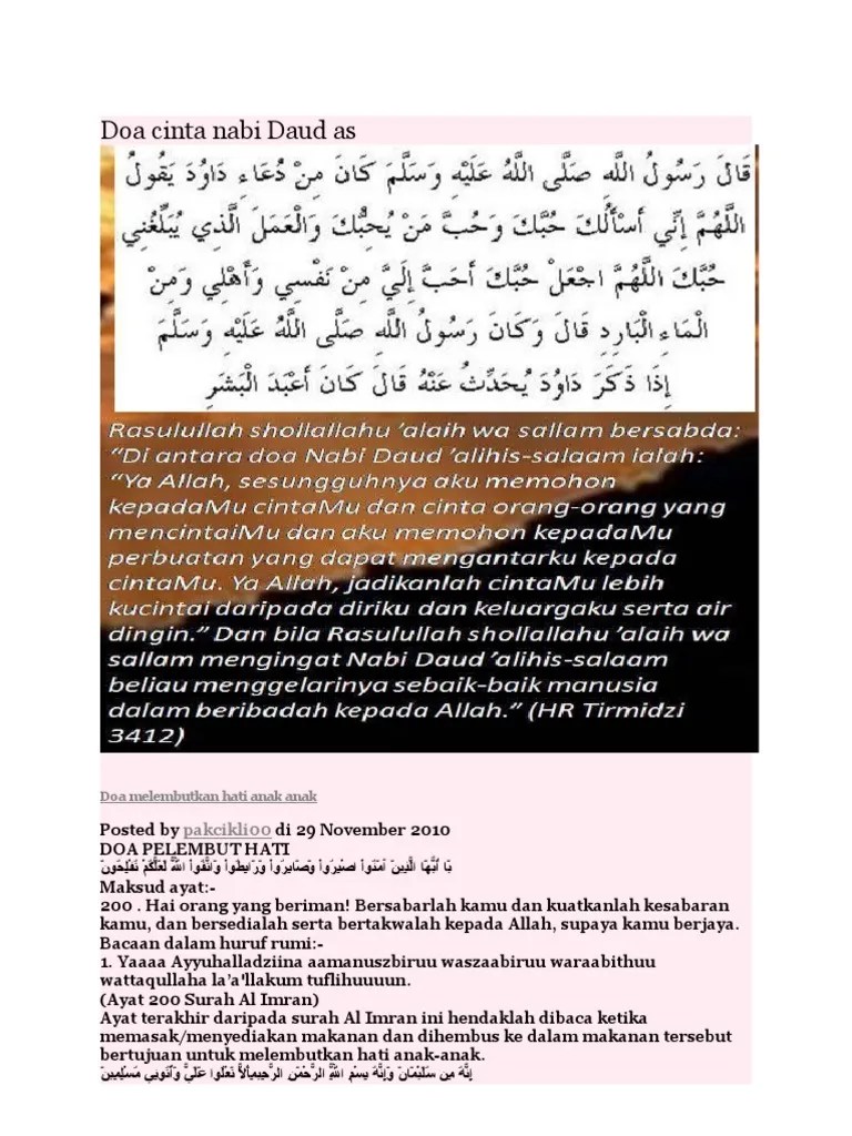 السَّلاَÙ…ُ عَÙ„َÙŠْÙƒُÙ…ْ ÙˆَرَØْÙ…َØ©ُ اللهِ ÙˆَبَرَÙƒَاتُÙ‡ُ. Doa melembutkan hati anak yang degil dalam rumi: Kemudian baca doa pelembut hati di bawah (tulisan rumi) : Kemudian baca doa pelembut hati …. 30,951 views jan 30, 2020 1. Surah yang baik untuk melembut hati yang keras terutama sekali dibacakan kepada ahli keluarga . Surah taha adalah surah yang ke 20, juzuk 16. Surah taha adalah surah yang ke 20, juzuk 16. Doa lembutkan hati ini boleh diamalkan untuk memperbaiki hubungan suami isteri dan juga. Doa melembutkan hati anak yang degil dalam rumi: